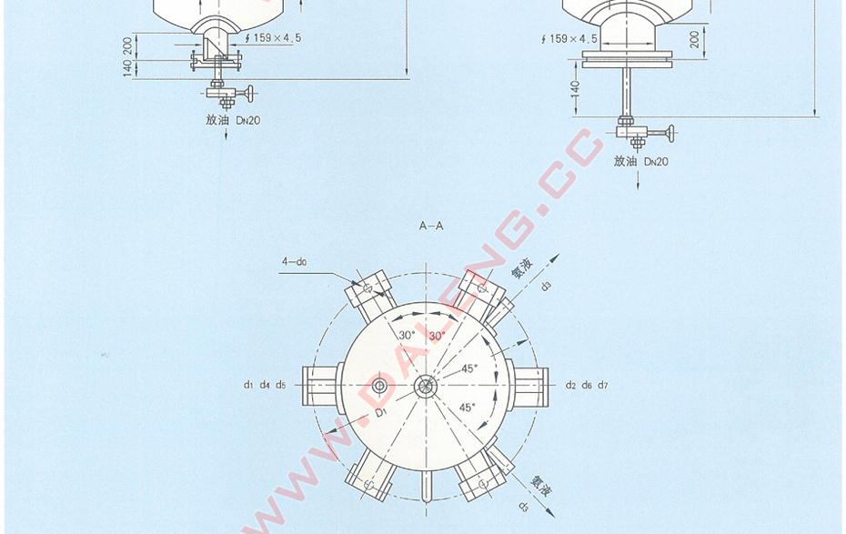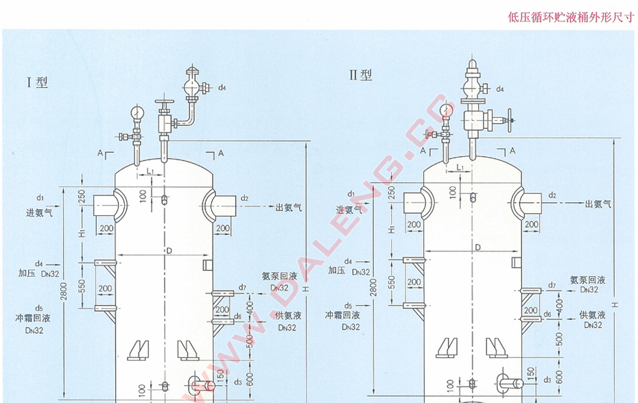 立式容器。主体为圆柱形简体及上、下两端与两只椭圆形封头焊接成一体所组成,简体上部两个侧面分别有进气、出气接管一个,在简体中部有供液接管,靠近下封头的筒体侧面有出液管,此出液管在系统中与氨泵相连。上封头装压力表与安全阔,下封头底部有放油阀。筒侧设有浮球阀(或液位控制器)上下二接管。