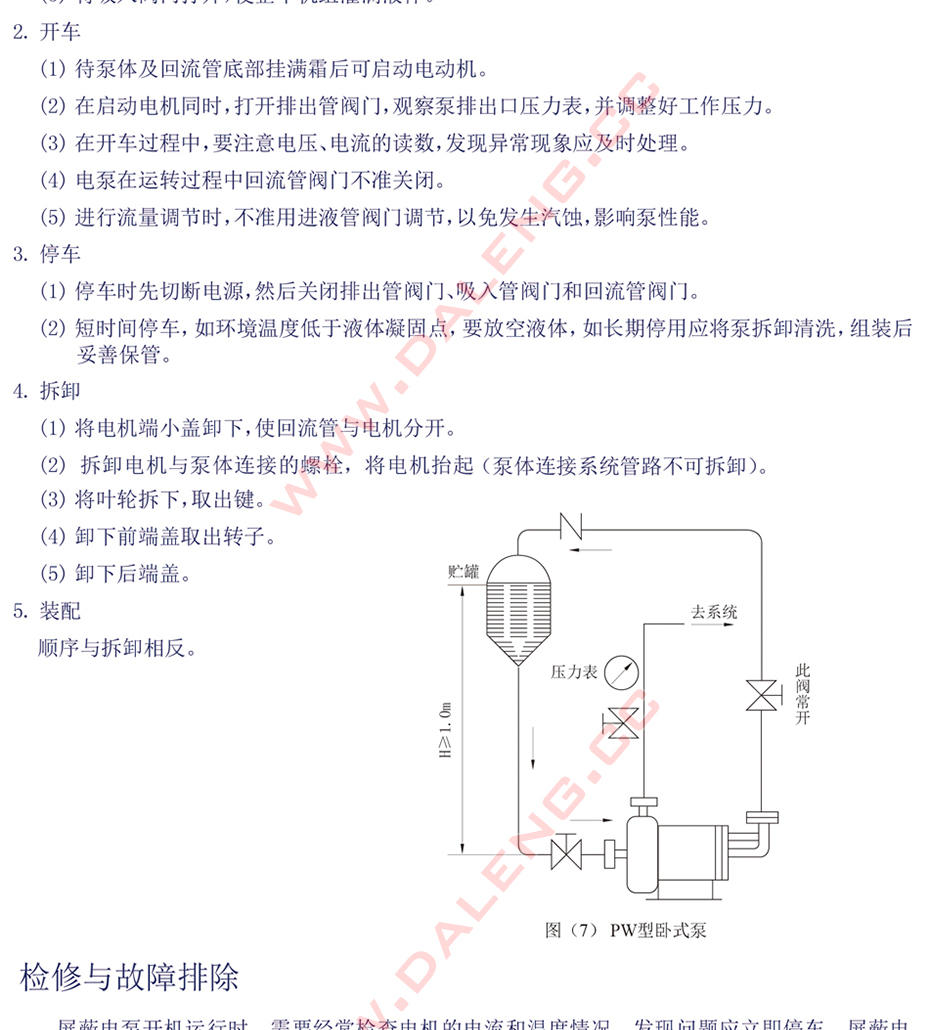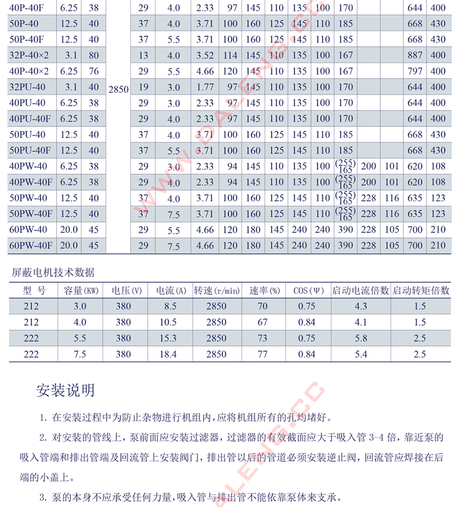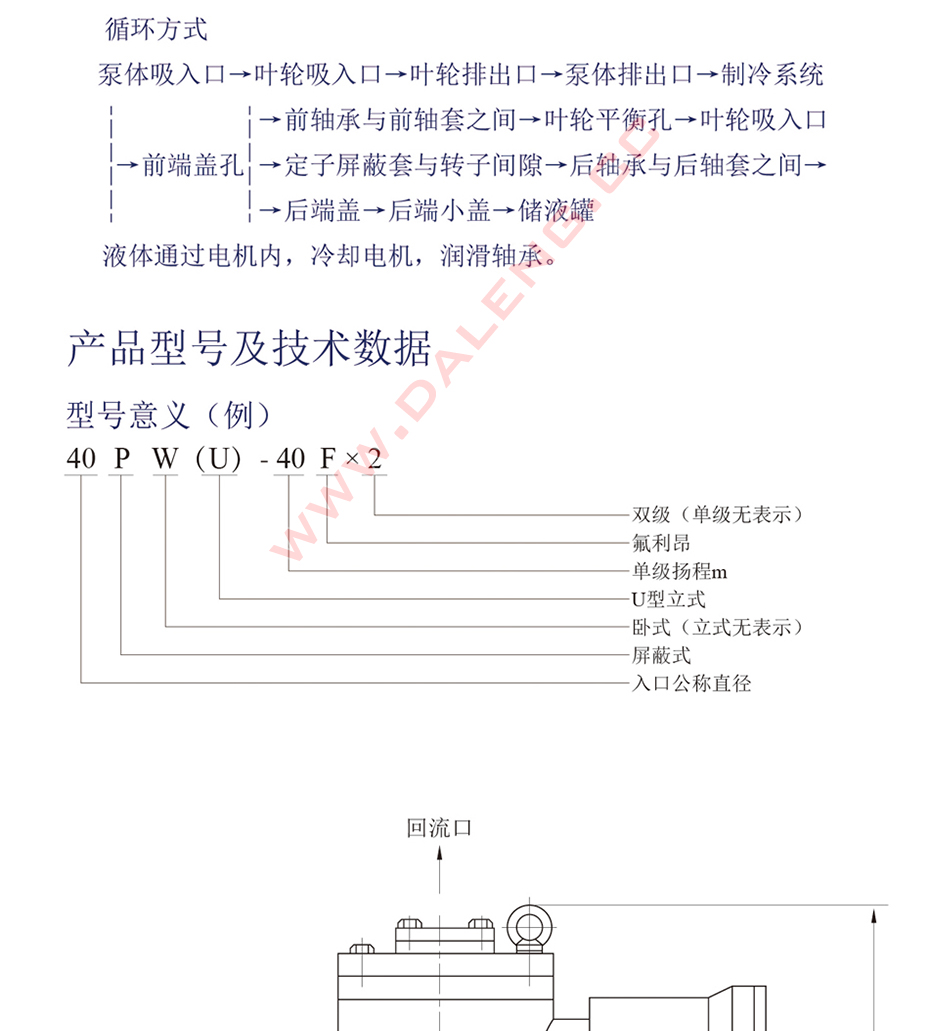 其中PU型、PW型系列屏蔽电泵的主要特征是在泵的进口处叶轮前端设有自吸能力装置。在氨氟制冷系统中,可以在-50℃的低温工况下保持正常的供液状态。并且因具有自吸能力,从而降低了对液体的液位高度设计要求,进一步降低了设备的安装高度。