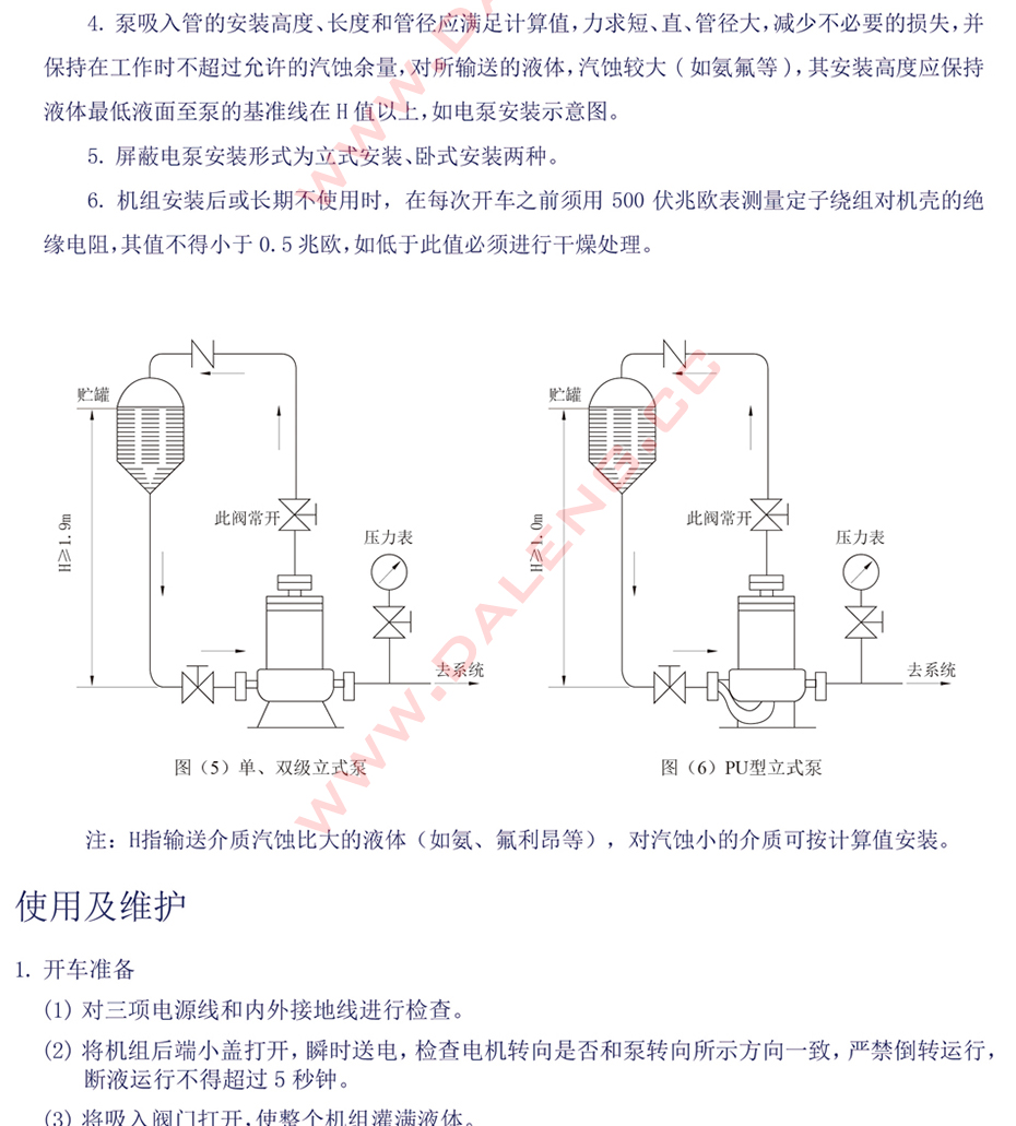 其中PU型、PW型系列屏蔽电泵的主要特征是在泵的进口处叶轮前端设有自吸能力装置。在氨氟制冷系统中,可以在-50℃的低温工况下保持正常的供液状态。并且因具有自吸能力,从而降低了对液体的液位高度设计要求,进一步降低了设备的安装高度。